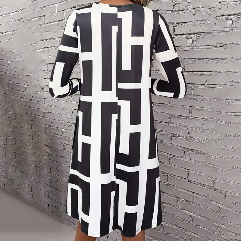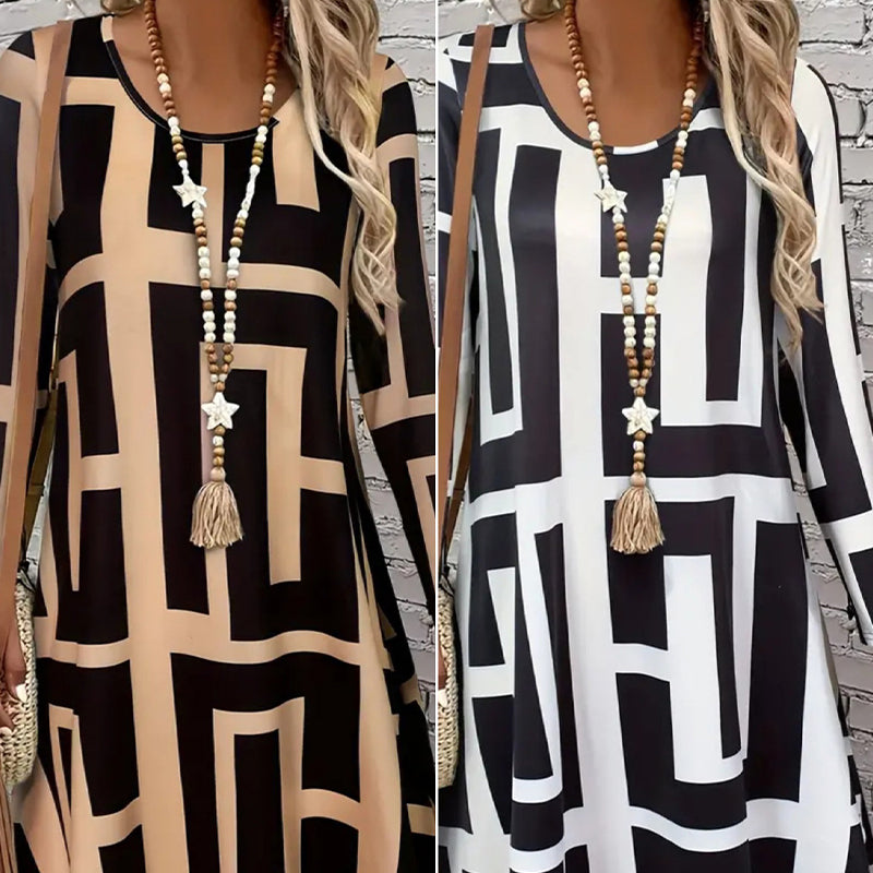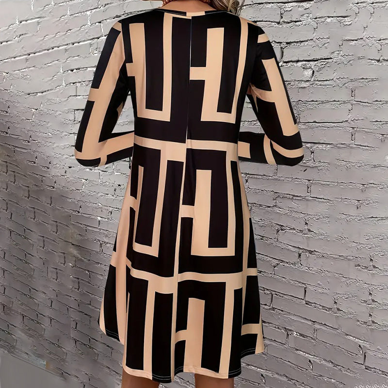 MODERNER GEO-PRINT: Der auffällige geometrische Print verleiht diesem klassischen Midikleid einen modernen Akzent und kombiniert lässigen Stil mit zeitloser Mode.
