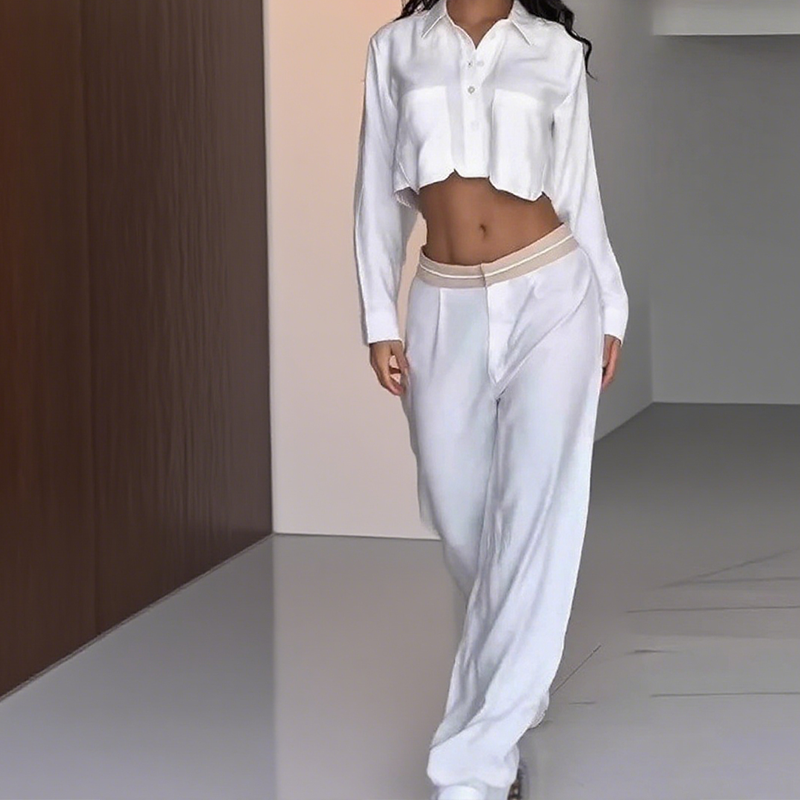 Women's Chic White 2-Piece Set - Short Shirt & Loose Pants