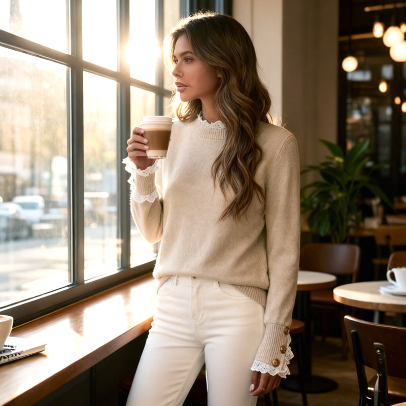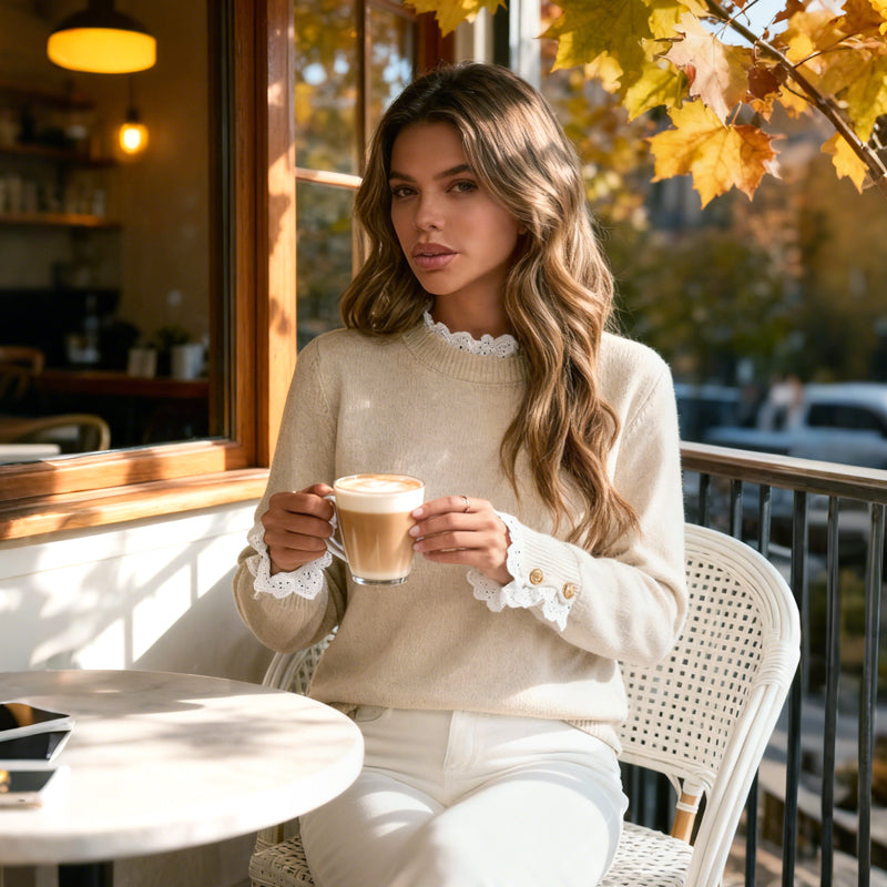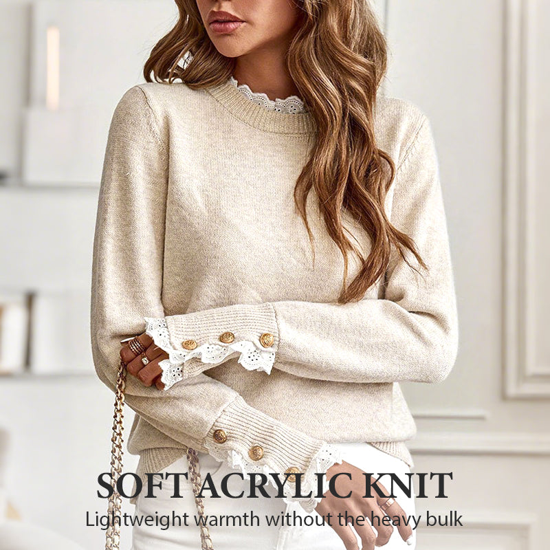 ELEGANTE SPITZENAKZENTE: Dieser Pullover besticht durch einen zarten Spitzenbesatz am Ausschnitt, der dem klassischen Pullover-Design einen Hauch romantischer Eleganz verleiht. Dieses subtile und doch raffinierte Detail wertet das Kleidungsstück sofort auf und macht es perfekt für legere Anlässe sowie für halb-elegante Gelegenheiten.