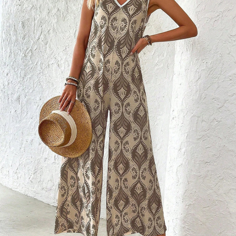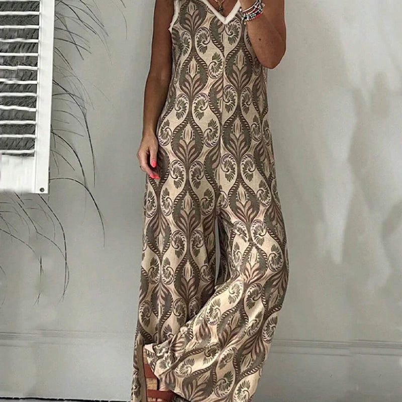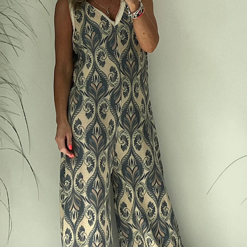 Vintage Jumpsuit mit V-Ausschnitt, ärmellos und mit Druckmuster