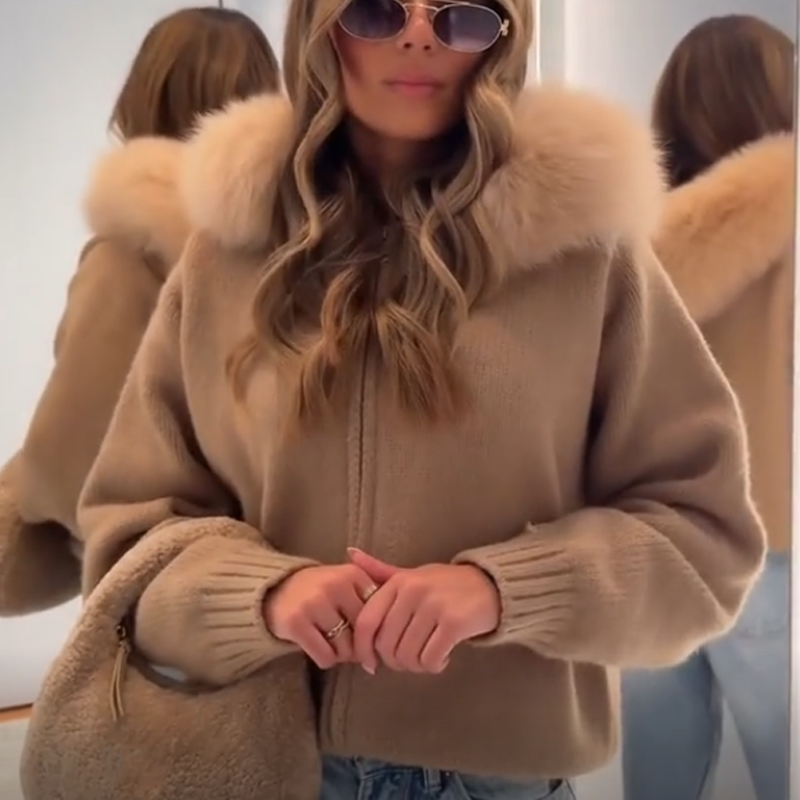 1 x Kuschelige Damen Strickjacke mit Kapuze und Kunstfellbesatz