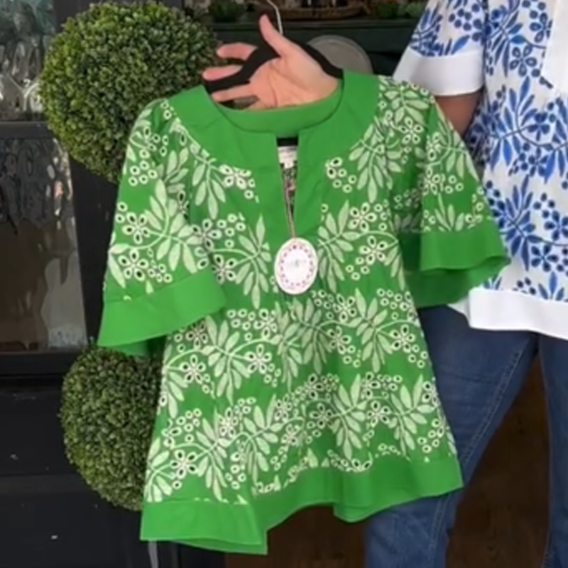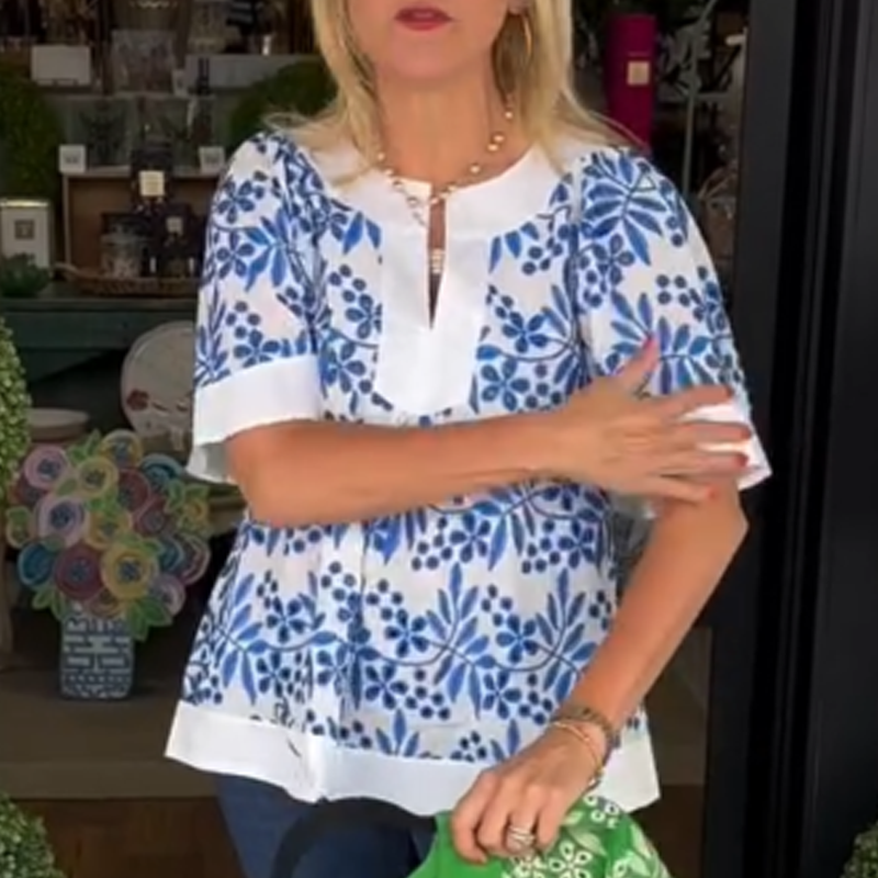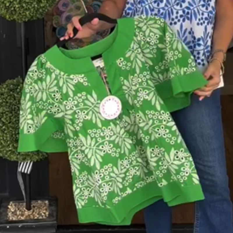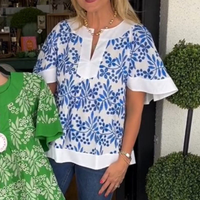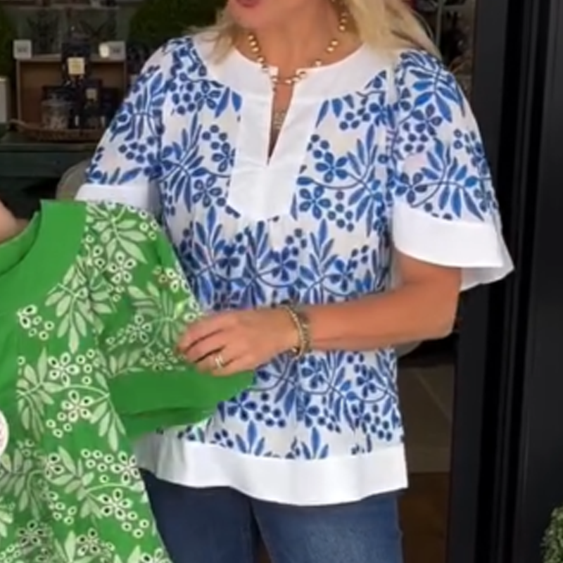 FRISCHER BOTANISCHER DRUCK – Das Top zeigt naturinspirierte, botanische Motive, die eine frische und einladende Ästhetik schaffen. Besonders hervorstechend sind die zarten, blumenförmigen Aussparungen, die in den Druck integriert sind und dem Design eine einzigartige und elegante Note verleihen. Diese unaufdringliche Verzierung hebt das Top von typischen Mustern ab und sorgt für subtile visuelle Akzente, während der gesamte Druck eine natürliche und belebende Stimmung vermittelt.