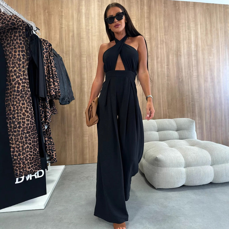 1 x Modischer, ärmelloser, rückenfreier, Sexy Neckholder-Jumpsuit für Damen mit weitem Bein