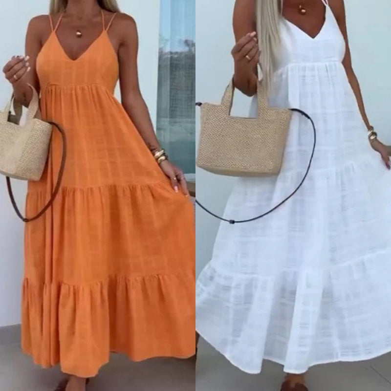 Lieferumfang: 1 * Trendiges Maxikleid mit V-Ausschnitt, Spaghetti-Trägern und gestuftem Schnitt für Damen