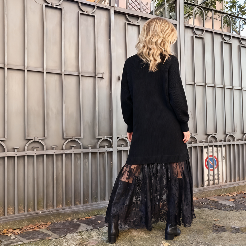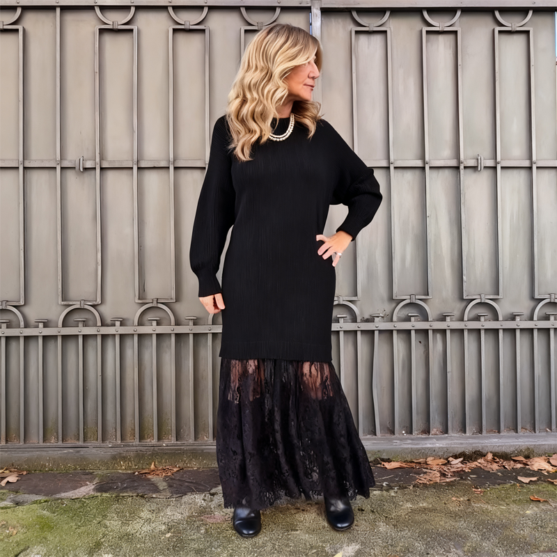 Elegantes Damenkleid mit Patchwork-Spitze am Saum