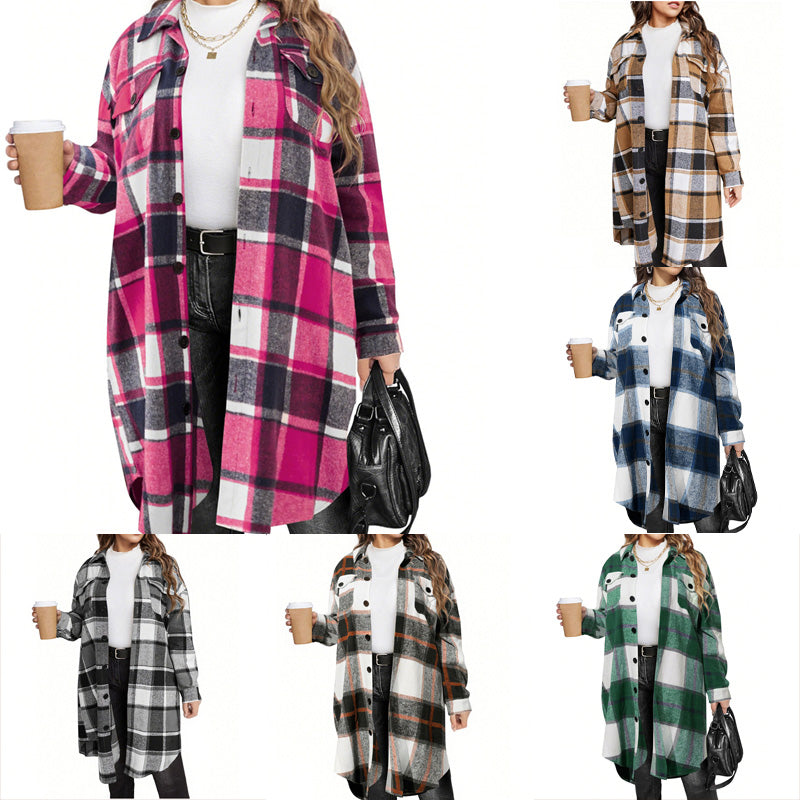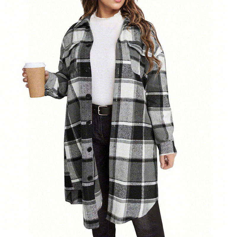 Stilvolle lange karierte Damen-Hemdjacke mit Umlegekragen