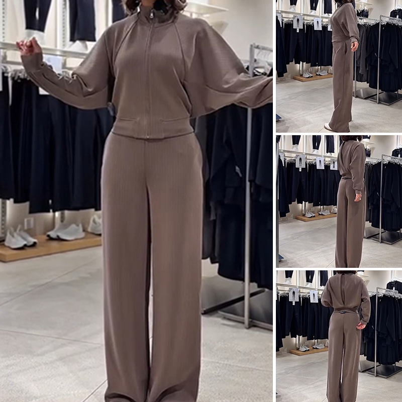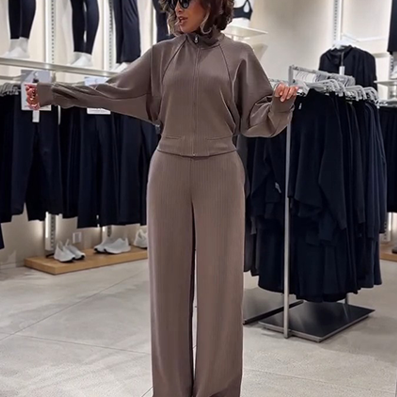 Damen lässiges lockeres zweiteiliges Set: Oberteil mit Reißverschluss & Hose