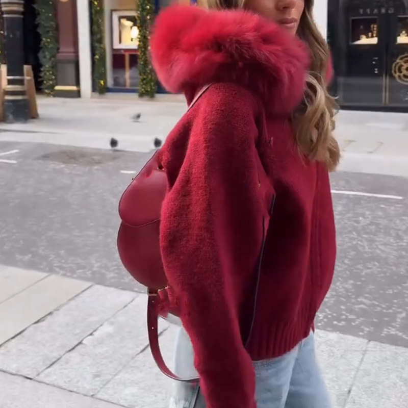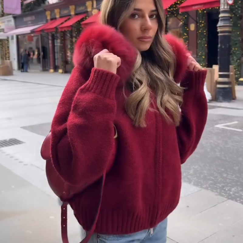 Kuschelige Damen Strickjacke mit Kapuze und Kunstfellbesatz