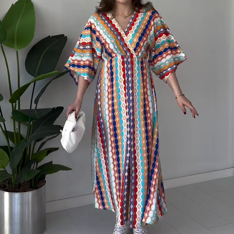 Maxikleid für Damen mit Print, Colorblock-Design und V-Ausschnitt