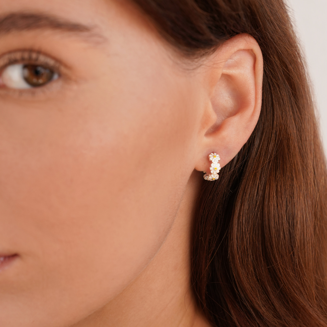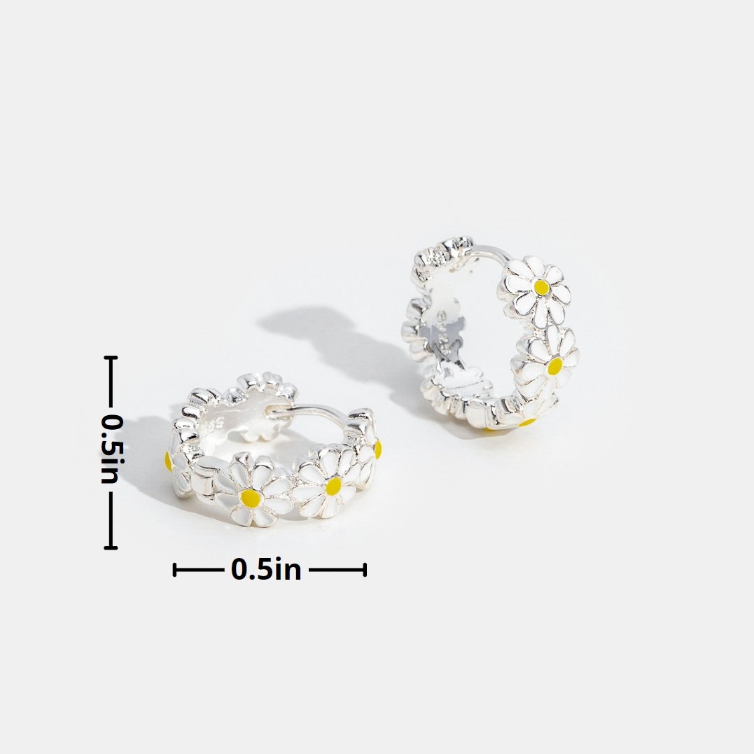 Daisy Flower Silver Hoop Earrings